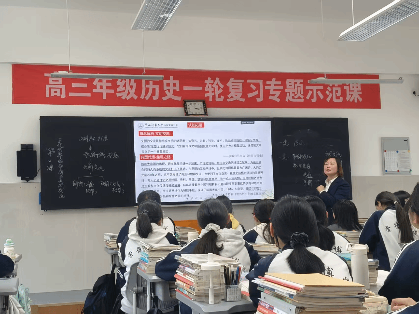陕西师范大学杨凌实验中学的专家以及骨干教师带来语文、英语、化学、历史学科的复习示范课展示。课堂上,教师们以情境导入、任务驱动替代单向讲授,把知识点融入小组互动、实践操作等环节中。学生不再是被动的知识接收者,而是在探究、讨论与实践中主动构建认知,课堂节奏紧凑而张弛有度,每一个环节都指向真实地学习成长,让“实效”从理念落地为生动的教学场景。听课教师通过观摩、对比和反思,找到了自身教学中的不足,进一步明确了复习课优化设计的路径,为整体提升陕西师范大学乌审旗实验学校高级中学高三年级的复习备考水平,为2026年高考再上新台阶奠定了坚实基础。